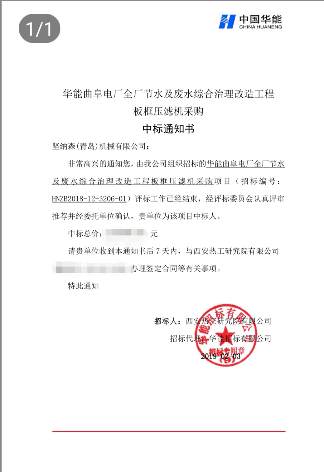 2019年2月3日(臘月二十九),春節(jié)前的最后一個(gè)工作日,堅(jiān)納森(青島)機(jī)械有限公司,收到西安熱工研究院有限公司頒發(fā)的:《華能曲阜電廠全廠節(jié)水及廢水綜合治理改造工程板框壓濾機(jī)采購(gòu)》中標(biāo)通知書。