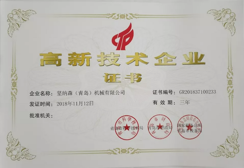 經(jīng)過幾年的努力,堅納森(青島)機械有限公司于2018年通過了青島科技局、財政局、稅務局聯(lián)合組織的專家評審,以及國家科技部、財政部、稅務總局的復核,在2018年11月12日獲得由青島科技局、財政局、稅務局聯(lián)合頒發(fā)的《高新技術企業(yè)證書》。